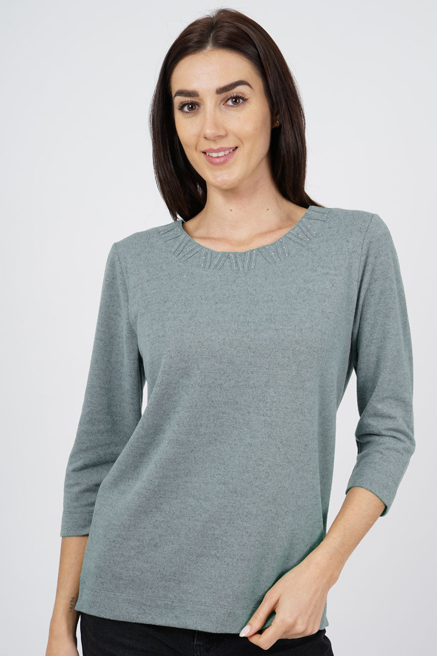 Truitje met 3/4 mouwen in effen lichtgrijze kleur. Met fantasie aan de hals. Ook verkrijgbaar in rood. Ruime maten.