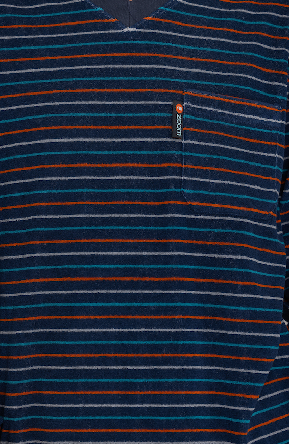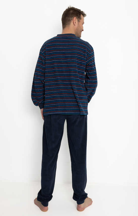 Pyjama voor heren met lange mouwen en lange broek in badstof in blauwe kleur. Vest met V hals. Borstzakje. Warm en zacht. Manchet aan de vest en de broek.