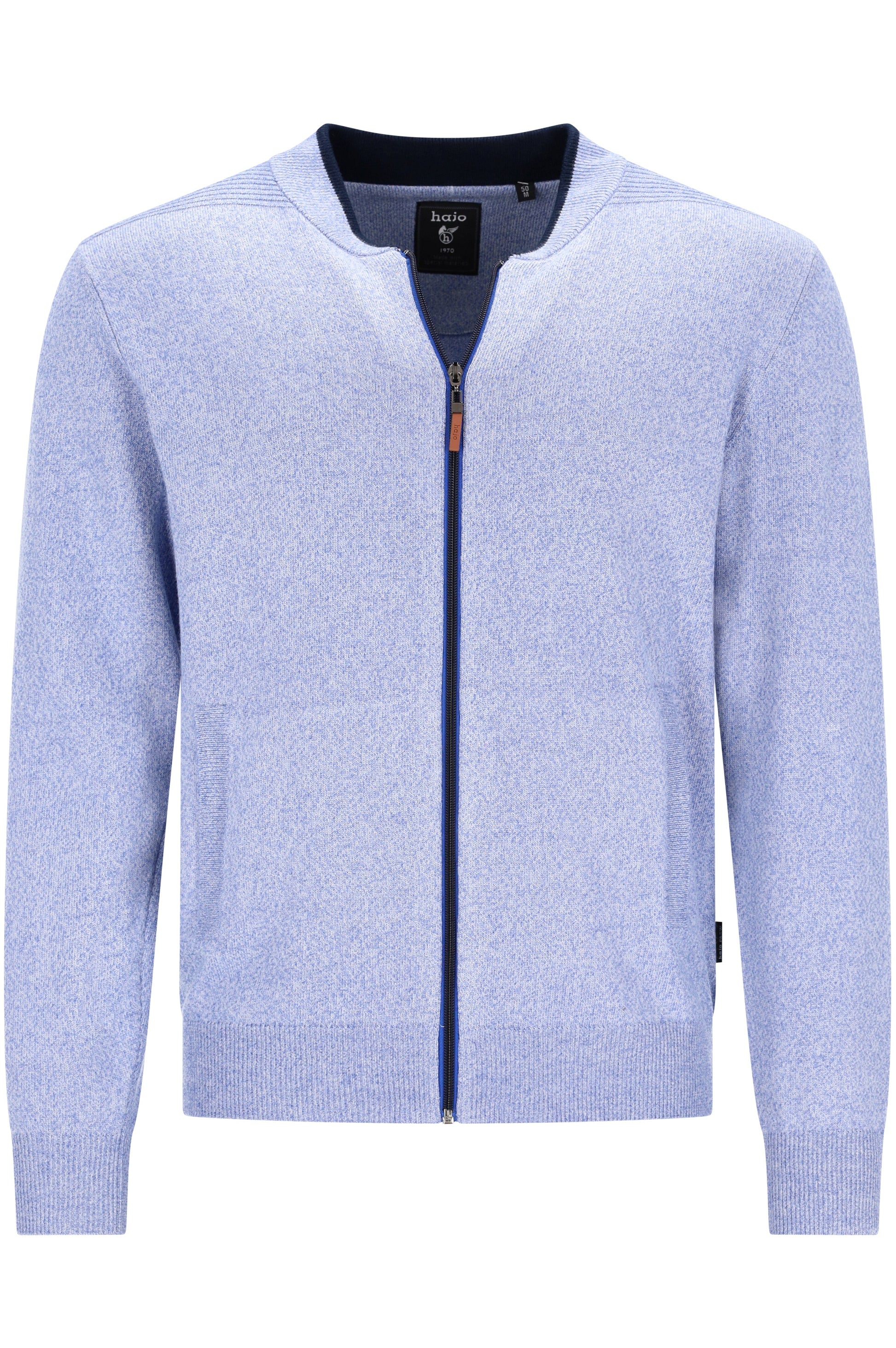 Gilet voor heren met lange mouwen en ritssluiting in tricotkatoen in lichtblauwe kleur van Hajo. 52% viscose 40% polyester - 8% polyamide. Met twee steekzakken. Sportief model.