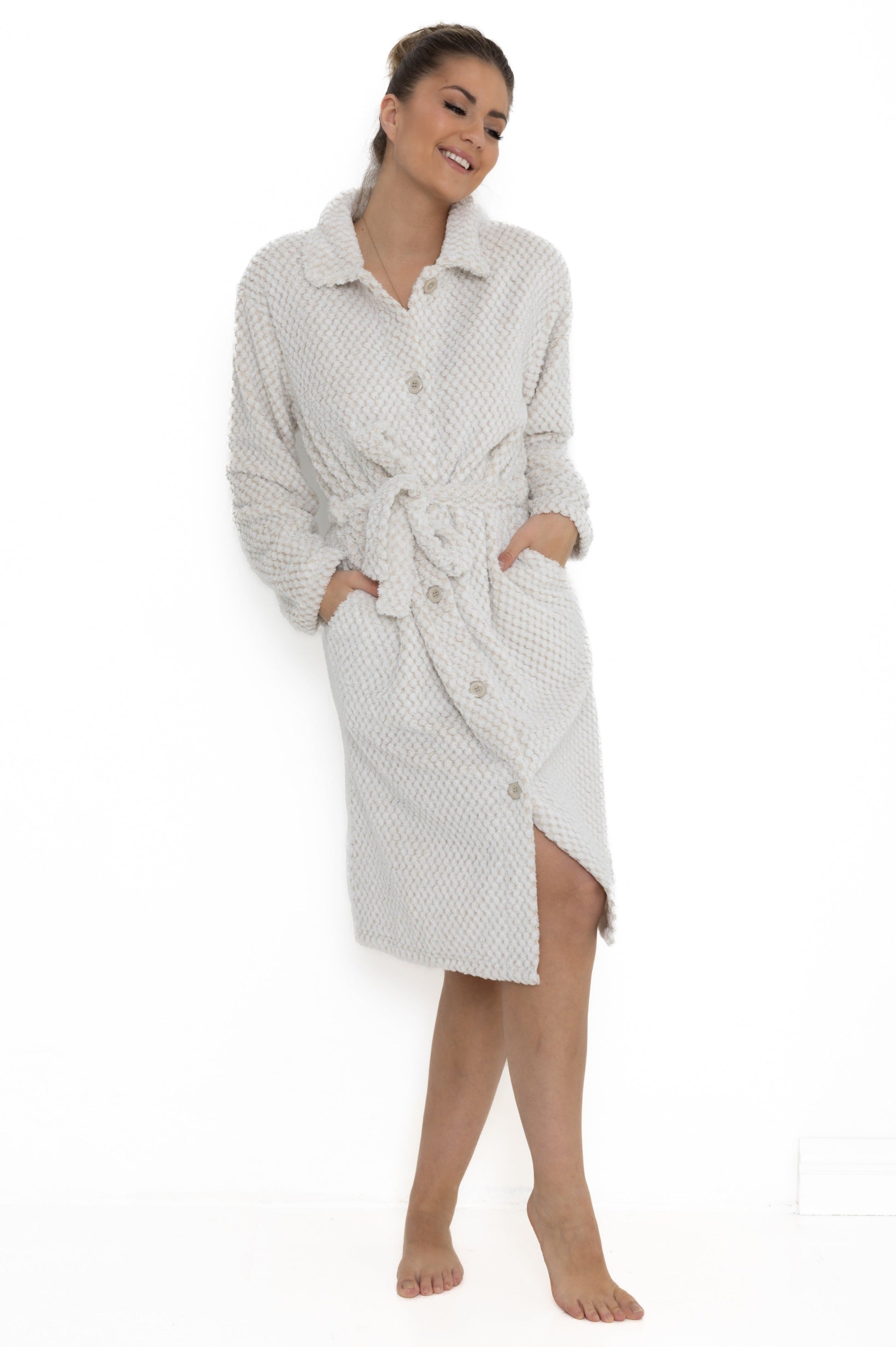Kamerjas voor dames met knopen en kraag in fleece. Warm en zacht. Verkrijgbaar in ecru noppen print.