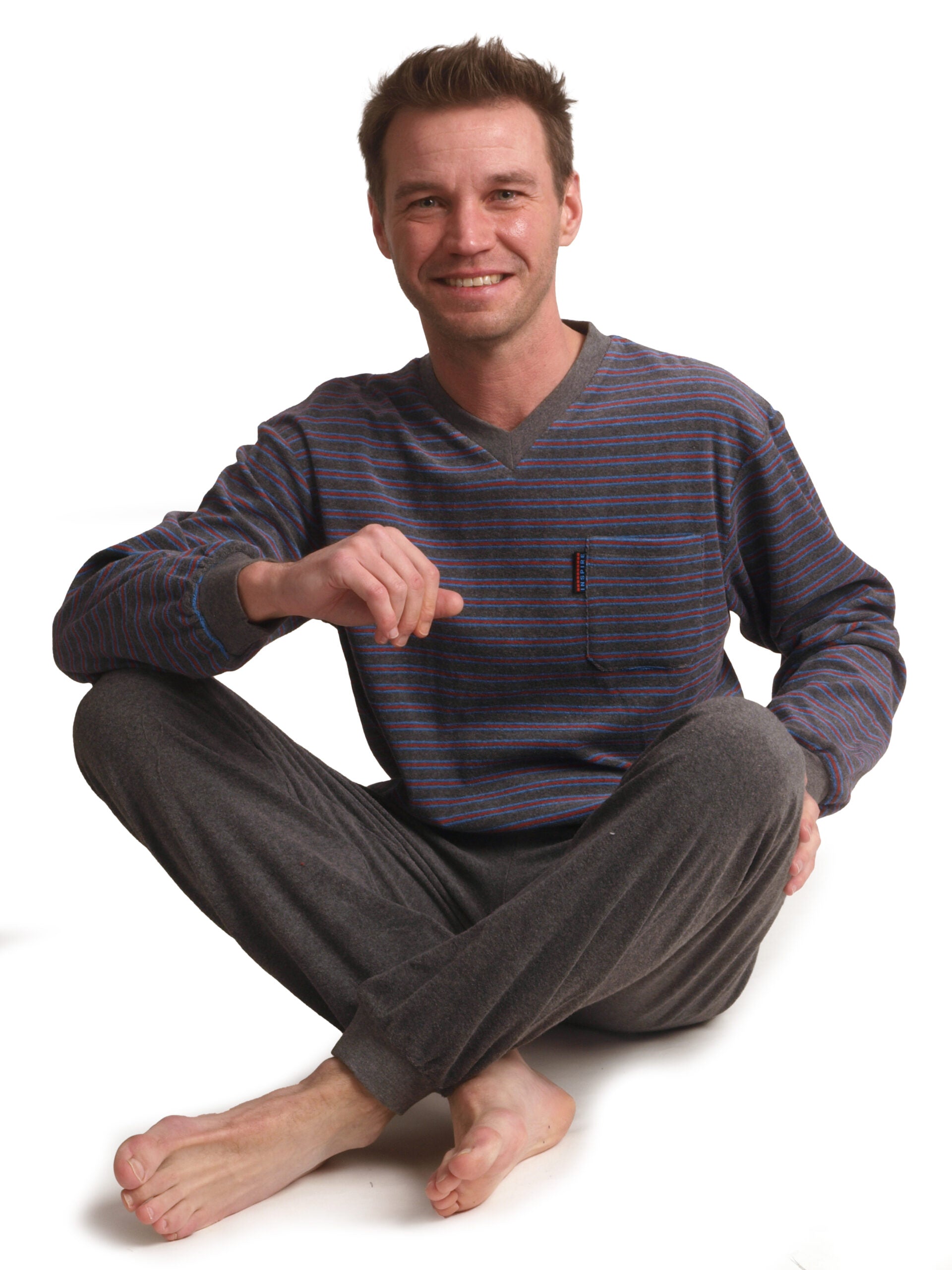 Pyjama voor heren met lange mouwen en lange broek in badstof in grijze kleur. Vest met V hals. Borstzakje. Warm en zacht. Manchet aan de vest en de broek. Ook verkrijgbaar in blauw.